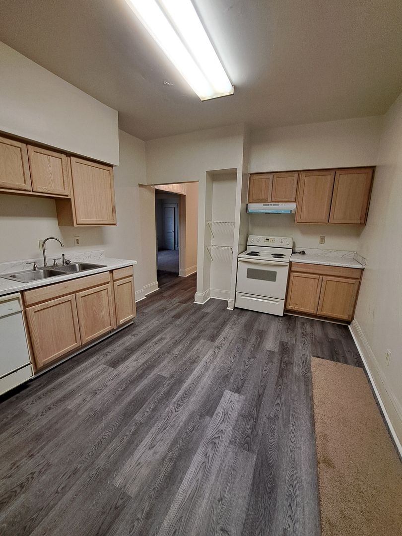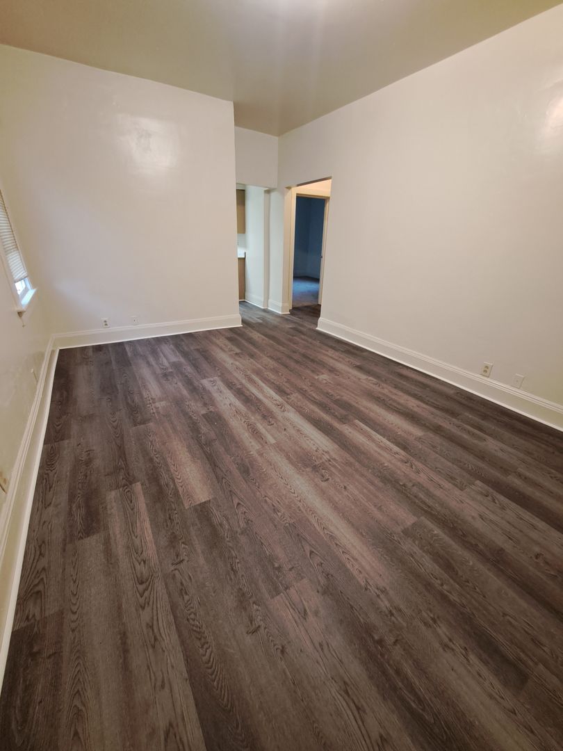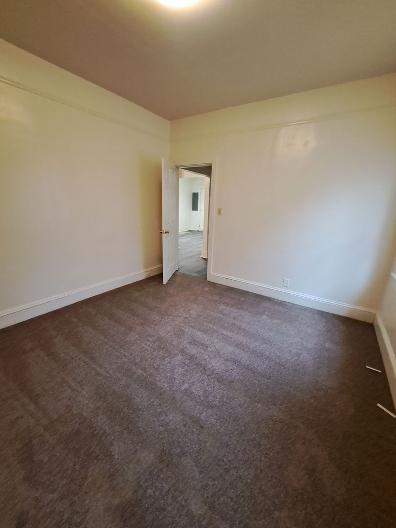 Large 3 bedroom upstairs apartment with central air and heat. Has been recently renovated with new kitchen cabinets, counters, wall to wall carpets LTV flooring, large enclosed rear porch with utility closet having washer dryer hookups and rear exterior stairway to on site parking off alley